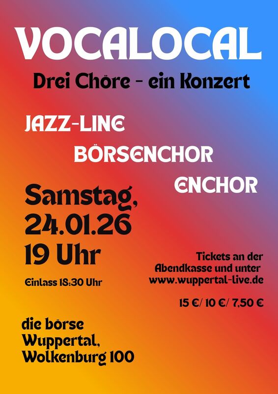 Am Samstag, den 24. Januar 2026 um 19 Uhr treten der Düsseldorfer Chor „Jazz-Line“, der Wuppertaler „Börsenchor“ sowie der „Enchor“ der Bergischen Musikschule auf der börsen-Bühne im Blauen Saal auf. Gemeinsam präsentieren die überwiegend a-cappella singenden Formationen aus dem Rheinland und dem Bergischen Land eine facettenreiche Auswahl aus ihren aktuellen Programmen – von Jazz und Pop über Klassik bis hin zu Funk. Euch erwartet ein Abend voller Gesangs- und Klangvielfalt.